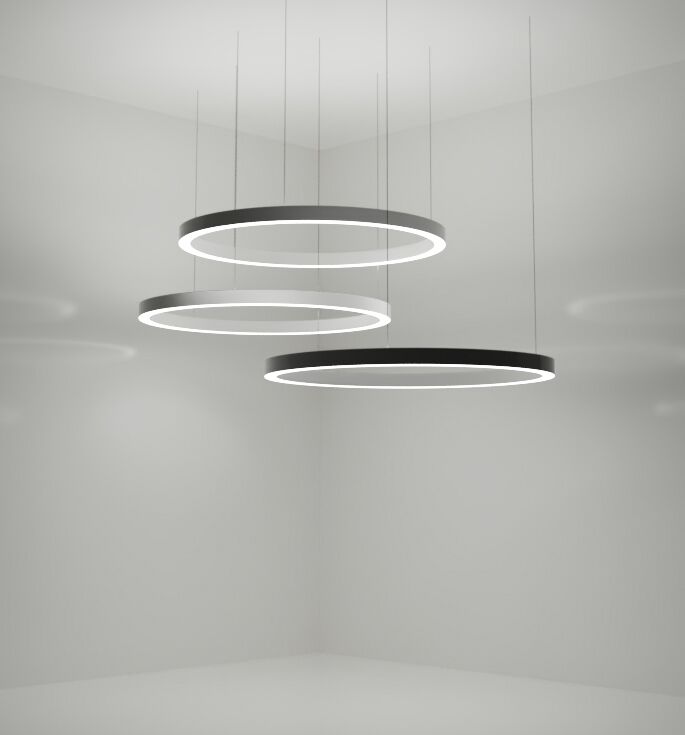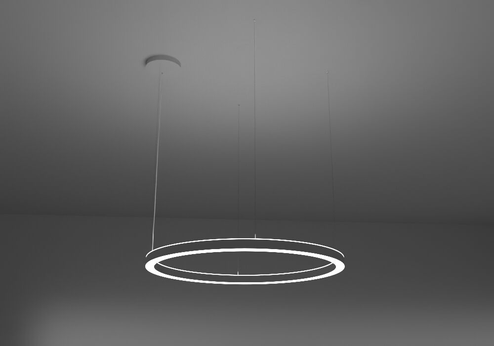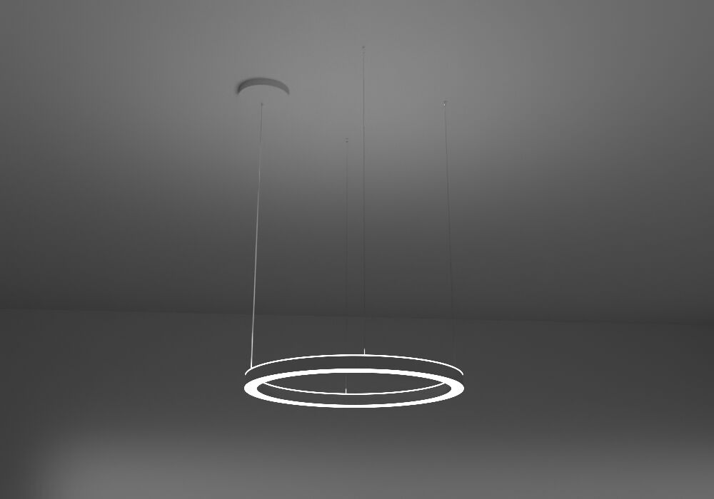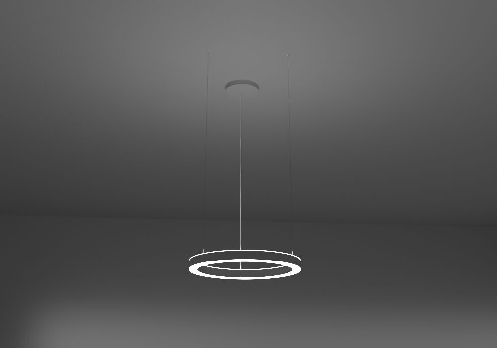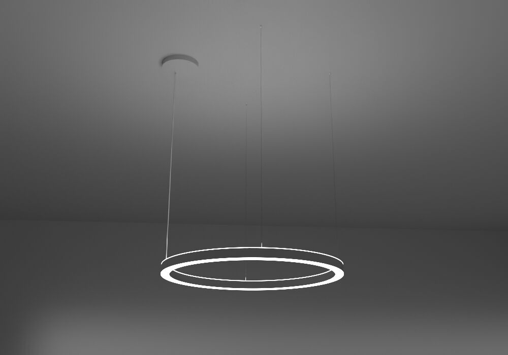 High-class ring LED luminaire, designed for direct-indirect light emission, with lamp housing in a compact design made of seamlessly welded steel sheet. Mounting by suspension cables, infinitely adjustable with quick release. 1:1 direct-indirect equal emission of light. Light emission through diffusers made of satin PMMA for an almost homogeneous emission of light. Diffusers direct-indirect with a height of 8mm for lateral emission of light. Luminaire equipped with the latest generation of LEDs, color rendering index Ra > 80, small color tolerance MacAdam 3. Electrical connection through 3 or 5-pin transparent power supply cable and ceiling housing. Optional mounting positions of the ceiling housing: offset or central.