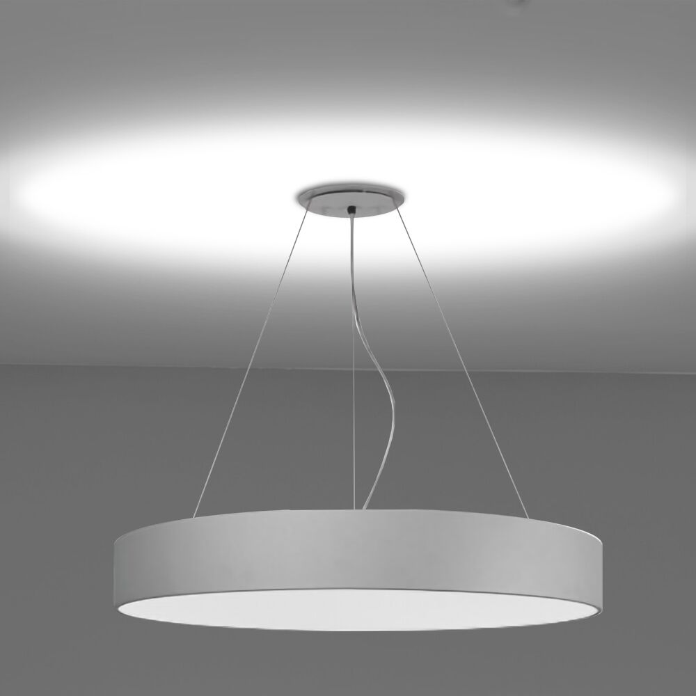 Round ceiling pendant light design. Produces direct-indirect lighting for a well-balanced room ambiance. No UV or heat radiation. Light content: direct 72% / indirect 28%. Powder-coated sheet steel housing. Diffuser insert opal made of acrylic glass. Simple ceiling mounting with 5-pin terminal. Operating device (LED Converter) integrated with 0-10V dimming.