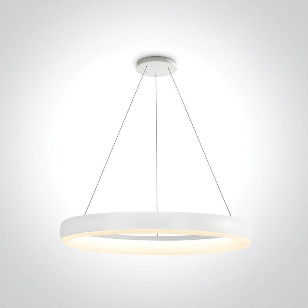 This 40W solitary ring ceiling pendant produces a warm white 2400 lumen and 3000K CCT with a color rendering index of 80. The illumination is downward, from the bottom and is available in either white or black finish. This fixture is rated IP20 for indoor usage. D63114W, D63114B.