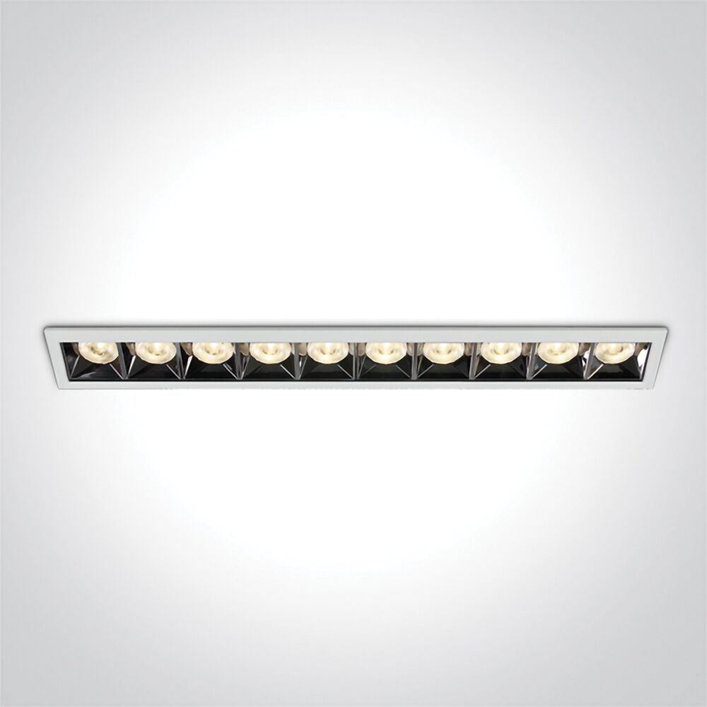 From our SENECA recessed spot family, this model has a full ten spots in a line, powered by 40W. The SENECA40 delivers 3200lm at 3000K, with a 90 CRI, in a 38º beam. This item is available in either a black or a white finish. Both options have a sleek dark chrome reflector.