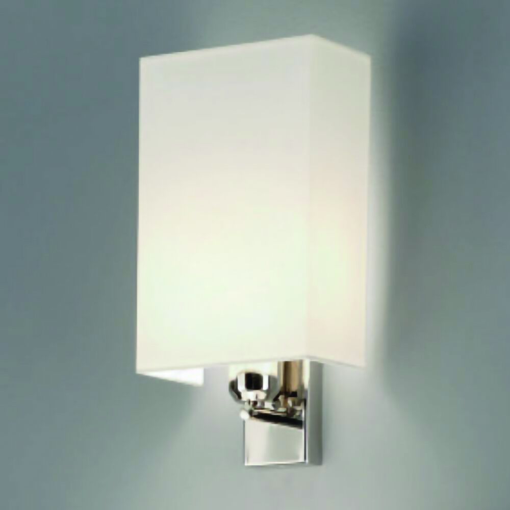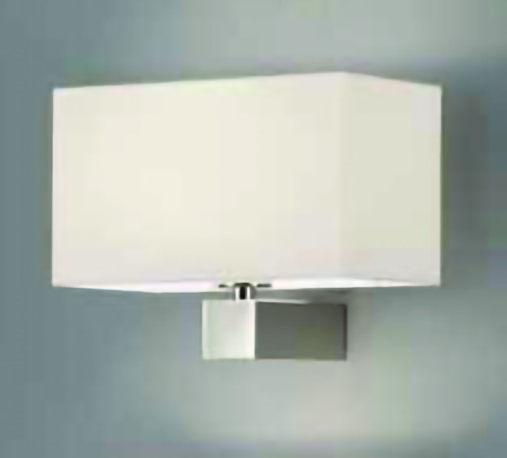 Multiple wall mount options of square, rectangular, or round shades. Reading light options available. Nickel or sterling silver finish with white shade.