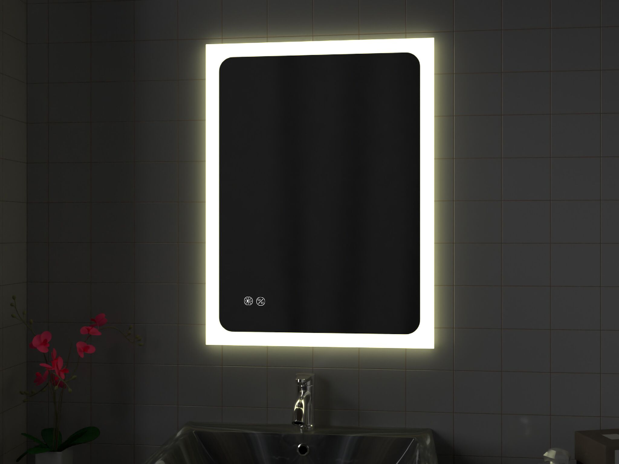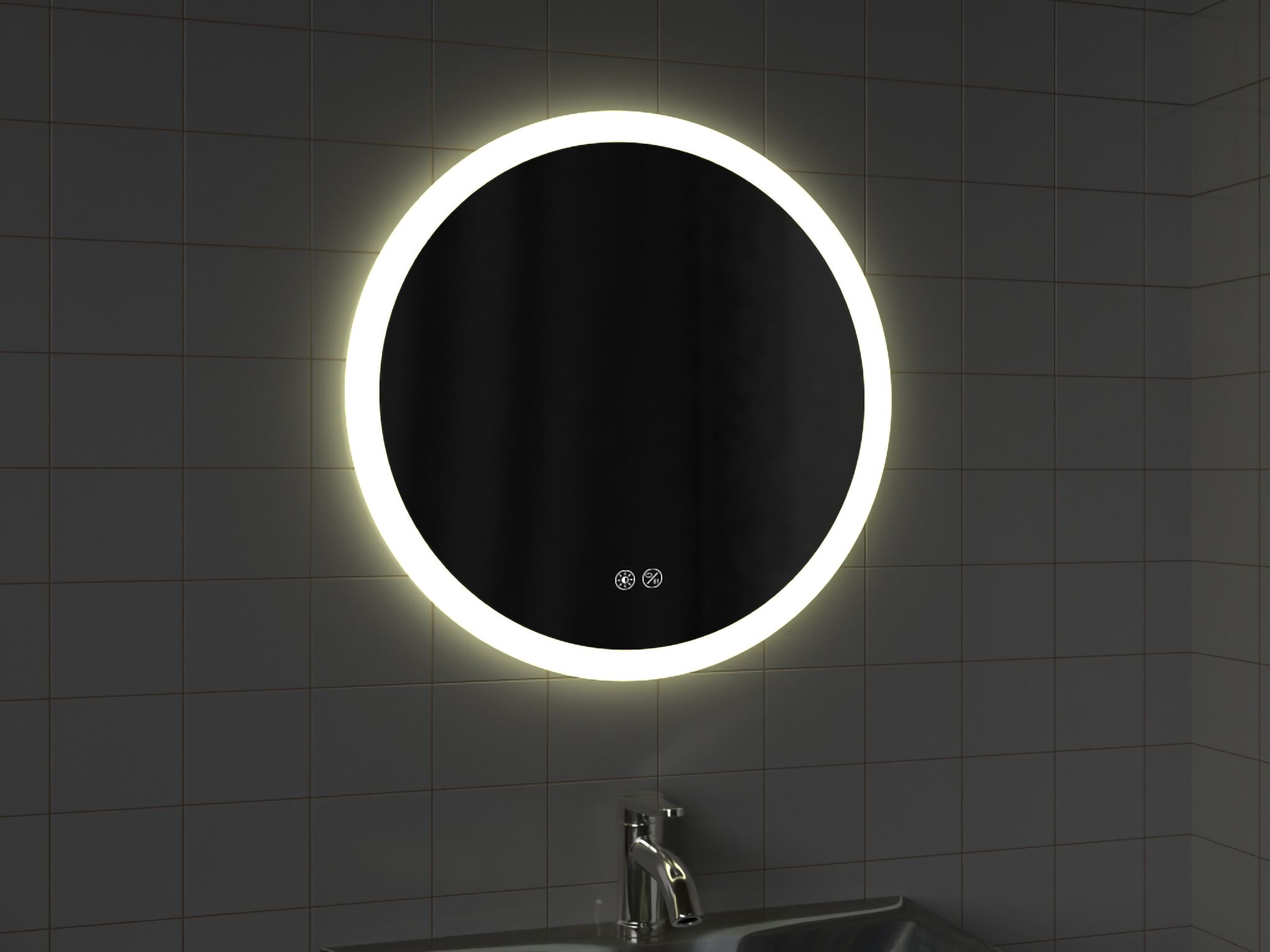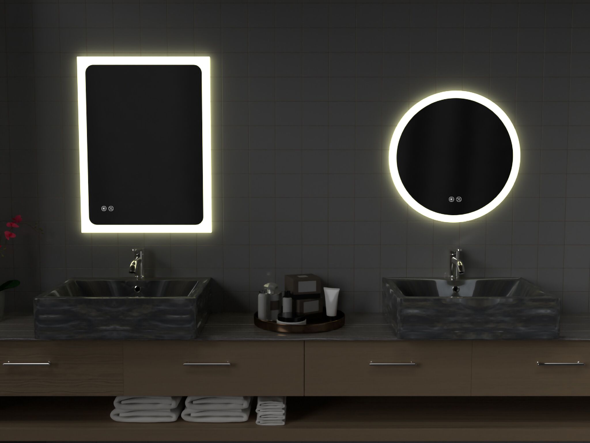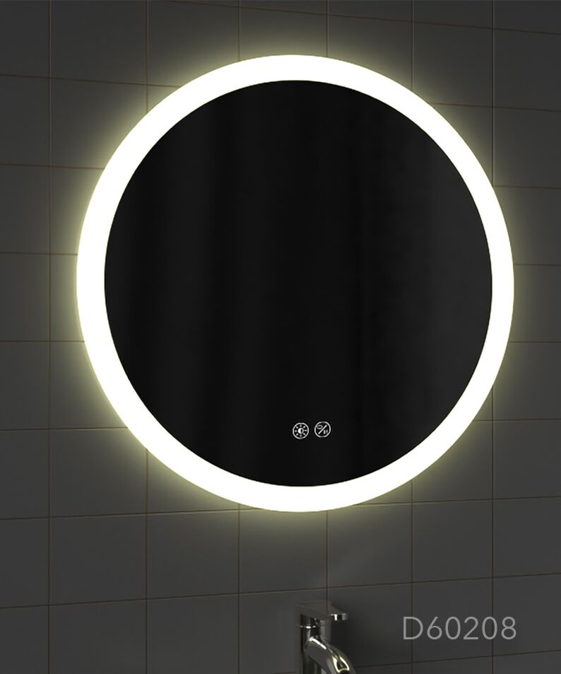 20W LED Round or Rectangular Mirror, IP44. Touch-dimmable and Touch-CCT adjustable (3000-6500K), with separate switches.